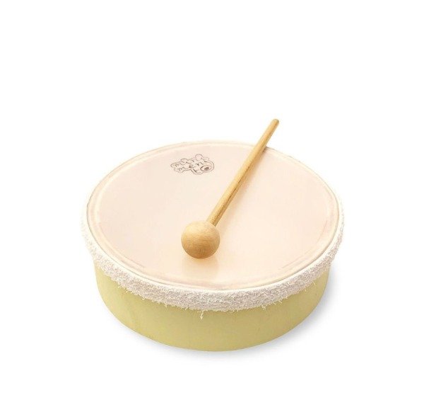 Aro de madera cubierto por un parche de Mylar en una de sus caras. El pandero viene acompañado por una baqueta de madera.