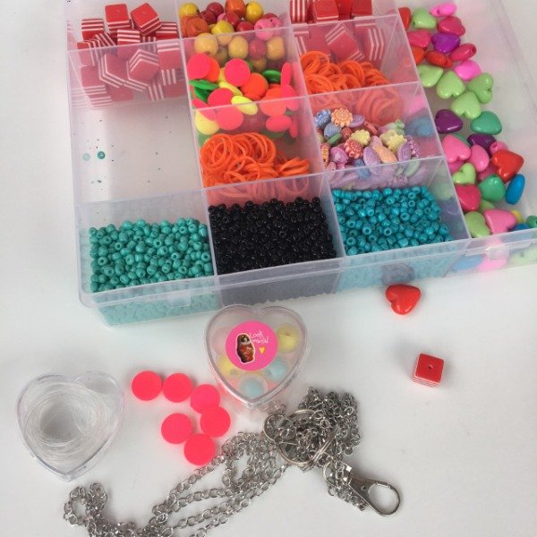 Viene con mostacillas de vidrio, plástico, acrílico, formitas de colores para usar de dijes, cadenas, arandelas y palitos metálicos para los dijes, gomitas, cordón, tanza y llaveros por si tenes ganas de armar otros tipos de accesorios!