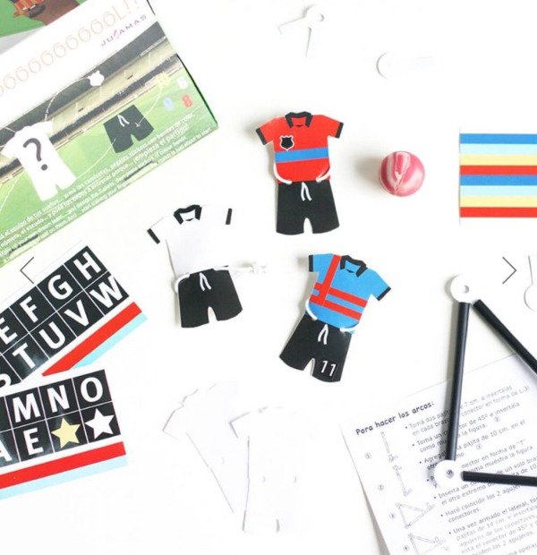 Contiene: camisetas, stickers para decorarlas, pelotita, kit para armar 2 arcos, elástico.
