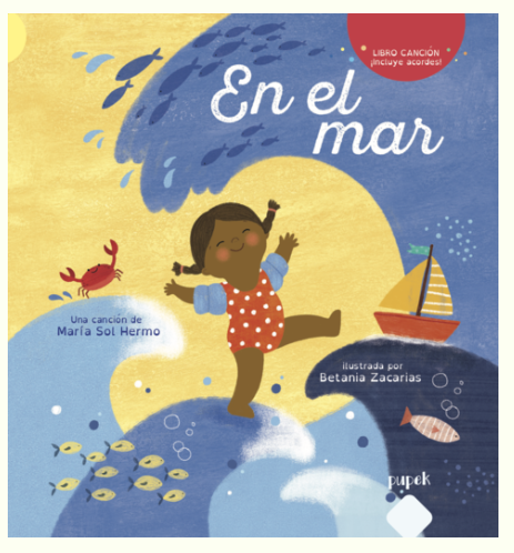 “En el mar, piso la arena/ quema, quema, quema/ salto las olas/ 1, 2, 3 y 4/ nado hasta el fondo/ pececitos, almejitas y piedritas/ Cuidado que viene el tiburón!” Hermosa y divertida canción del grupo musical Agua de Sol para cantar y bailar en familia. La canción cuenta las aventuras de una niña en la playa: caminar por la arena y construir castillos, nadar en el mar, y encontrarse con un tiburón que terminará siendo muy amigable. Las bellísimas ilustraciones de Betania Zacarías, coloridas y de gran impacto, nos sumergen en esta canción ilustrada con sabor a mar. Incluye acordes y código QR para escuchar la canción.