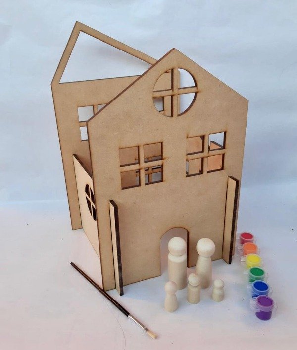 Juego simbólico + kit de arte que incluye 1 casita encastrable triangular de fibrofacil (37 cm x 24cm), familia peg dolls (5 integrantes), 6 potes de témpera chicos y 1 pincel. Esta propuesta de juego libre incluye 1 bolsa de tela para guardar el kit de arte y los peg dolls .