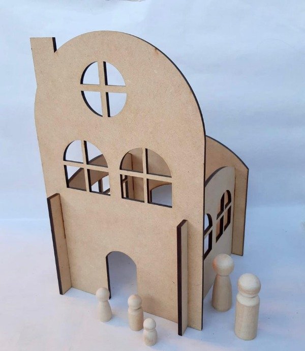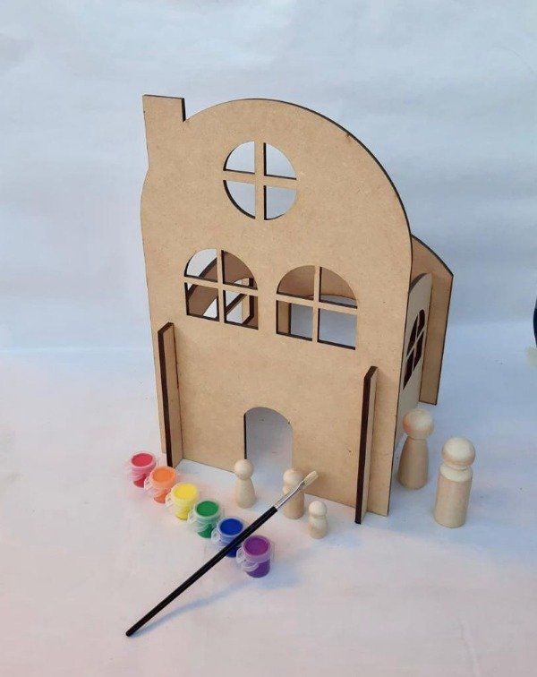 Juego simbólico + kit de arte que incluye 1 casita encastrable circular de fibrofacil (37 cm x 24cm), familia peg dolls (5 integrantes), 6 potes de témpera chicos y 1 pincel. Esta propuesta de juego libre incluye 1 bolsa de tela para guardar el kit de arte y los peg dolls .