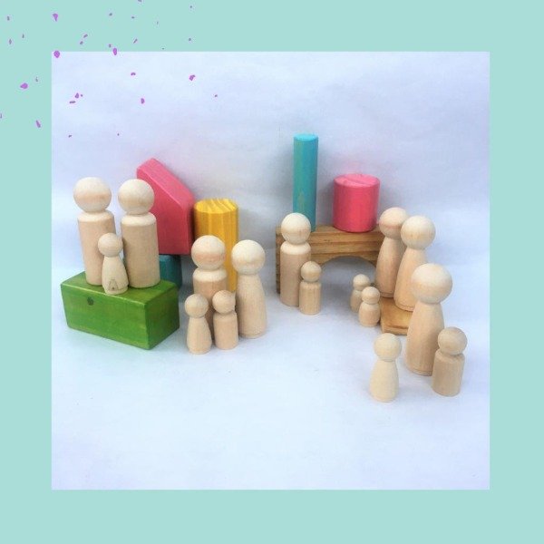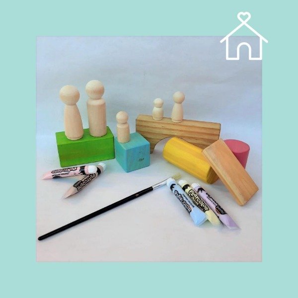 Familia Peg Dolls (5 integrantes diferentes) + kit de arte (1 pincel y 6 pomos de témperas de distintos colores) . Incluye una bolsa de lienzo para guardar y trasladar con facilidad.